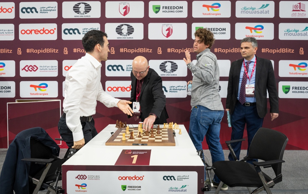 The arbiters were called in, and the incident – already visible on camera – was reviewed. Sector arbiter Chris Bird consulted with the players and explained the rules applicable in this situation. According to the regulations – which were presented to the players in the Technical Meeting ahead of each tournament – if a player brings the game into disrepute “with the intention of preventing their time expiring, the player should expect to be penalised by losing the game.” After hearing to the explanation, Carlsen accepted the decision and shook Martirosyan’s hand.